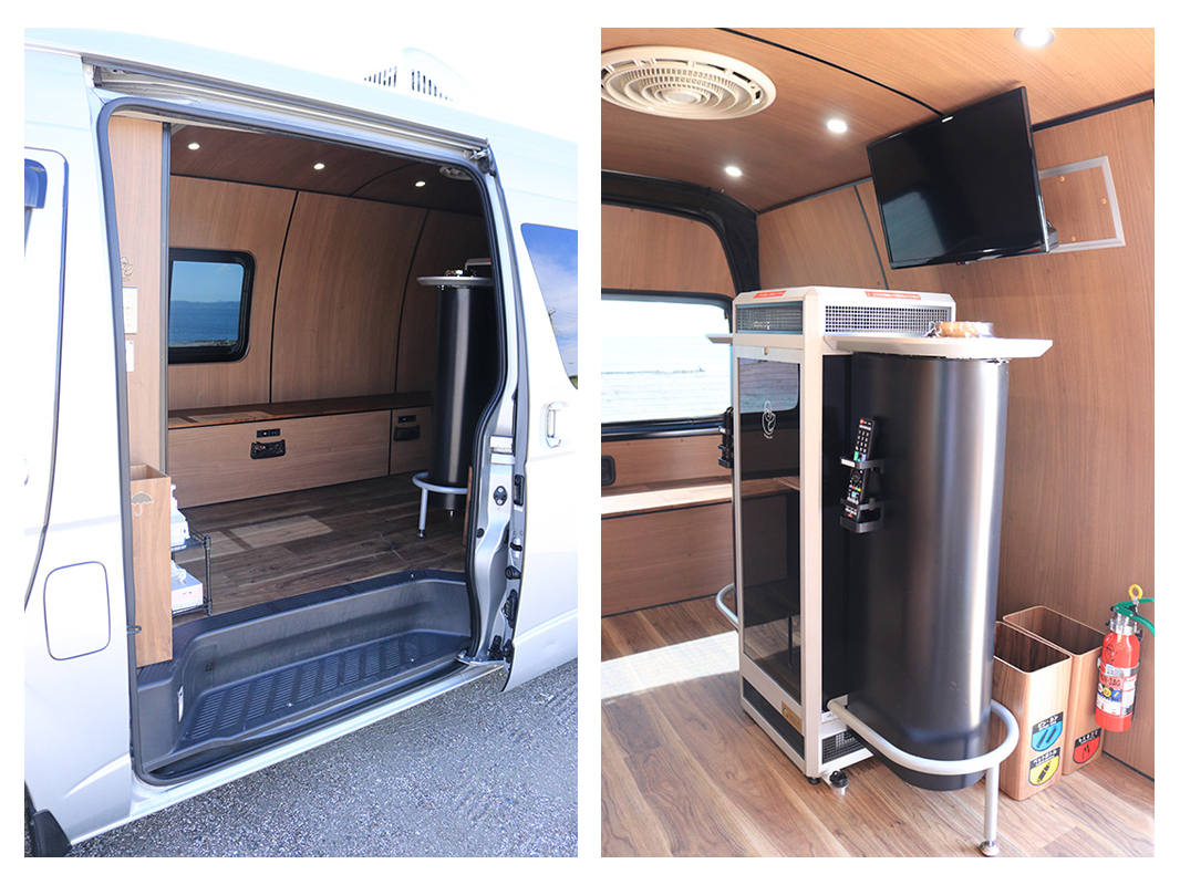 ハイエースの荷室部分に喫煙所を再現し、空気清浄機・換気扇・冷暖房完備して車のエンジンを切っても100Vでも使用可能です。